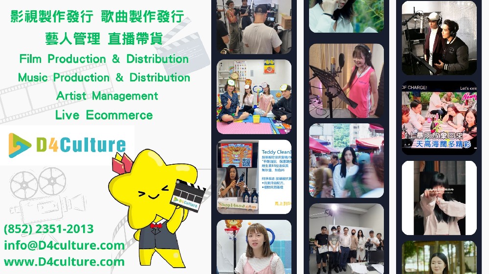 D4Culture是一家專業影視娛樂公司,從事電影和音樂製作以及人才管理,總部設於香港,於中國大陸及新加坡有分公司。憑藉對創造力的熱情和對卓越的承諾,D4Culture 已成為不少客戶值得信賴的合作夥伴。 我們的電影製作團隊致力於創作優質的電影及微電影,與世界各地的觀眾產生共鳴。從概念開發到後期製作,D4Culture 充分利用我們的專業知識和行業知識,確保製作的每個製作都具有最高的質量,D4Culture也提供影視發行、電檢申請、字幕及配音等服務。 除了電影製作之外,D4Culture 還提供音樂製作服務等服務,讓音樂願景變為現實。我們具豐富經驗的專業團隊與藝人密切合作,創作出既創新又具有商業可行性的音樂,在競爭日益激烈的行業中脫穎而出。 作為一家藝人管理公司,D4Culture 致力於幫助藝人取得成功並充分發揮潛力。我們提供一系列服務,包括藝人發展培訓、職業規劃和業務代理,幫助藝人建立成功和可持續的職業生涯。D4Culture 成為尋求優質娛樂產品體驗的客戶和影視投資者的理想合作夥伴。